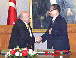 中國國家主席江澤民與土耳其總統德米雷爾4月19日在安卡拉會談后簽署了聯合公報。中新社記者 彭偉祥 攝