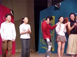 評論:時尚喜劇《翠花,上酸菜》因何火爆? 2002年02月06日 10:16 ![]() 翠劇主要貫穿人物王小怡(喬瑜巖飾) 南方鯤 攝 ![]() 翠花上酸菜演員謝幕 南方鯤 攝 中新網(wǎng)北京2月6日消息(作者南方鯤)中戲表演98班集體改編創(chuàng)作的喜劇〈翠花,上酸菜〉,在年終歲末火爆了京城話劇舞臺。目前正在實驗話劇院劇場進(jìn)行第三輪演出。 由班主任田有良導(dǎo)演、這個班十幾位初出茅廬的同學(xué)協(xié)力演出的這出戲,取材當(dāng)今都市青年網(wǎng)民的時尚生活——網(wǎng)上交友求偶的種種經(jīng)歷,這些多半淺俗入世或時顯奇誕不經(jīng)的人物遭遇,如何在該劇中能演繹得環(huán)環(huán)相連令人忍俊不禁,以至這部內(nèi)容看似平常的喜劇先于去年十二月在青藝劇場勁演旬余、新年一月份移師兒藝劇院再演十來場均場場爆滿,以至其票房效益居同期首都話劇界之首呢? 仔細(xì)琢磨一下該劇就能看出,年輕的導(dǎo)演和演職員們對改編原作電視劇的素材作了頗有藝術(shù)追求的再創(chuàng)作。他們讓主要角色表演及所構(gòu)成的生活圖景,不時或因時尚行為卡通化、而具詼諧反諷之效;或因男女角反串演示和“土”“洋”人物定位倒置、而顯其黑色幽默韻味。另一更突出的效果,則因編導(dǎo)頗具匠心地將時下人們耳熟能詳?shù)碾娨晱V告語言,(包括一組以新聞形式出現(xiàn)的宣傳廣告),經(jīng)由表演形象再現(xiàn),將其固有的浮躁夸張色彩聚焦放大,鋪染在全劇各段落之間,和劇中的奇、躁色調(diào)形成別致的參差對照,凸顯了觀照時尚生活之荒誕性的黑色幽默。 顯然,《翠》劇年輕的創(chuàng)作者們在透視概括生活的厚度和表現(xiàn)力度上尚有加強(qiáng)的余地,然而可貴的是,他們對現(xiàn)代話劇藝術(shù)的理解顯示出有著一種靈敏的悟性;有了這種悟性,才可能在本文稱為時尚喜劇的創(chuàng)作中,做到“淺入深出”(實應(yīng)為“潛入深出”)。正因為如此,見多識廣的北京觀眾對該劇給予了相當(dāng)熱情的接納。