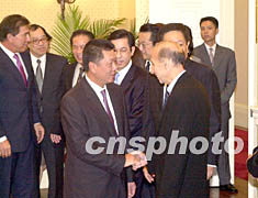 澳門特區行政長官何厚鏵二十四日與永利度假村(澳門)股份有限公司簽署協議后,與永利部分股東握手。李剛 攝