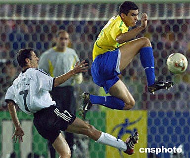 圖:世界杯德巴決戰 盧西奧騰空躍起阻擋對手 2002年06月30日 19:49 ![]() 6月30日2002韓日世界杯決賽巴西與德國隊的決賽在日本橫濱國際競技體育場進行,上半場比分為0:0。圖為巴西隊盧西奧騰空躍起阻擋德國前鋒諾伊維爾。