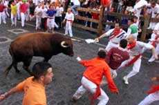 圖:西班牙奔牛節造成多人受傷 2002年07月08日 19:59 ![]() 7月6日,一年一度的奔牛節在西班牙潘普洛納市拉開帷幕。活動當天,就有數人在斗牛狂奔過程中被牛角刮傷。據稱,今年的奔牛節是近年來最危險的一次。圖為奔跑的人們引領著瘋狂的公牛。(春風)