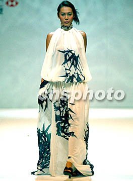 圖:港時裝節展示鄧達智的“水墨畫”女裙 2002年07月12日 10:11 ![]() “2003香港春夏時裝節”7月10日晚舉行香港十位頂尖設計師作品展示,模特身著設計師鄧達智的一件上繪墨竹全白透明沙裙款款款而行,宛如一幅流動的中國水墨國畫。任晨鳴 攝