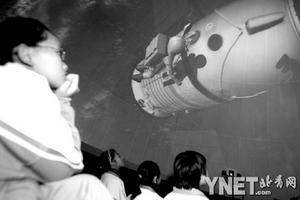 抬頭仰望,漫天的星斗。北京57中學的學生坐在學校的穹幕劇場里,宛如身在太空一樣,月球在他們的頭頂輕輕地轉動。隨著一聲號令,嫦娥一號拔地而起,從他們的頭頂奔向月球。不少的學生忍不住想要摸一把“嫦娥”,讓“嫦娥”帶著他們一起飛向月球。昨天下午1點30分,初一學生江聰迪、王聿倫和同學們一起,這樣立體地重溫了“嫦娥”奔月的震撼瞬間。