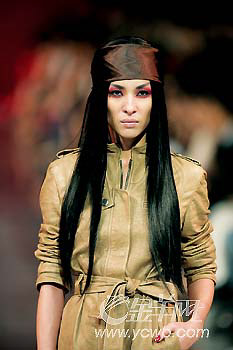 Dior2006-2007秋冬秀場(chǎng)的模特讓人印象深刻的,除了設(shè)計(jì)夸張的墨鏡外,人人都有一頭如旗幟般飄逸柔順的長(zhǎng)直發(fā),統(tǒng)統(tǒng)包裹在紫褐色頭巾下,很有上世紀(jì)80年代的懷舊感。但更重要的是,每件衣服都暗含硬朗的符號(hào),就像模特們脫掉墨鏡之后,露出詭異的紅色眼妝一樣,她們似乎都在堅(jiān)定地走不妥協(xié)路線。