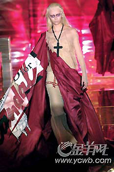 場地內(nèi)鋪天蓋地的紅色光影,眼眶涂抹厚重陰影,表情冰冷僵硬如同雕像的模特,身著鮮紅塔夫綢長裙,發(fā)布會伊始就彌漫著宗教與政治相互交織的濃烈味道。一名模特兒的頸上,還繪上了法國大革命發(fā)生的年代———“1789”刺青圖案。繁復(fù)綴飾的馬甲、抓皺的波紋和高腰典雅的長禮服,怵目驚心之下卻深刻地展現(xiàn)出風華年代的衰敗感。就連最后謝幕時,JohnGalliano也以華麗的舞劍串場,來結(jié)束此季演出,精采十足。