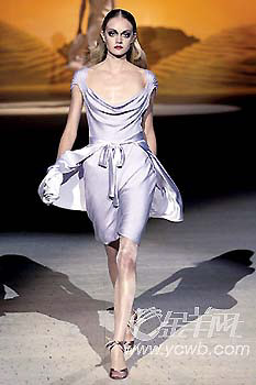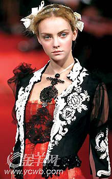 ChristianLacroix的時裝以設(shè)計復(fù)雜多變、風格瑰麗多彩見稱,他在這一季的高級定制女裝展中,最搶眼的是一襲如夢似幻的象牙色的雪紡紗短裙,紗裙上有精致的刺繡花朵,不論是用料和細節(jié)處理都極為細致,美麗得令人屏息!敖稹笔亲钅荛W耀奢華的色調(diào),更被ChristianLacroix于今季帶有濃郁宮廷色彩的系列中大量運用:鑲滿珠寶鉆飾的包款鞋,層疊在衣領(lǐng)、袖口或是裙擺的蕾絲荷葉邊,當然還有各式各樣富麗貴氣的頭飾。配合瑰麗的設(shè)計風格,充分表現(xiàn)出法國式的艷麗。