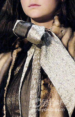 沙礫般的金屬色領巾系成夸耀的大蝴蝶結,正好配襯皮草大衣的華麗,而拼接在金色領巾上的黑色薄紗則增加了幾分收斂的柔軟感覺。