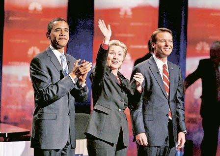 正在沖刺初選的美國前第一夫人希拉里·克林頓在從拉斯維加斯飛往內華達的競選專機上,出人意料地模仿空姐的口吻,對媒體記者和競選幕僚致以調侃式的問候,向人們展示了“鐵娘子”剛強外表下的幽默風趣一面。分析人士指出,希拉里顯然總結了不久前“眼淚門”的成功經(jīng)驗,繼續(xù)軟化自己的形象,以此拉近與選民的距離。