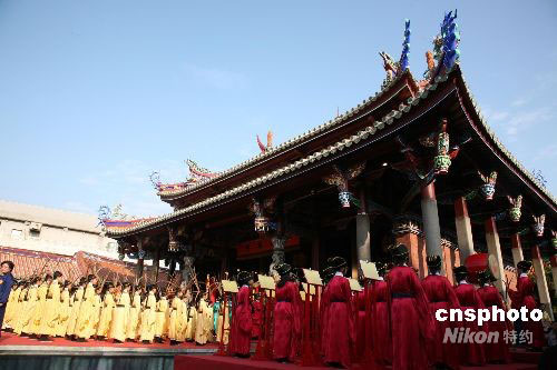 今年是孔子誕辰二千五百五十八周年,原應九月二十八日舉行的臺北祭孔大典,因強臺風“薔薇”來襲而延至十月五日進行。中新社發 楊旭 攝