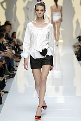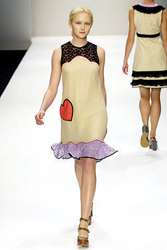 Rebecca Taylor的乖乖女設計,讓我們看到了充滿學生味的情竇初開,同樣將愛心做成口袋的還有Eley Kishimoto,將絲綢和蕾絲拼合而成的短裙,那個醒目的紅色愛心不時跳躍在模特輕松的步伐上。愛心的另一種表現則被設計師們巧妙地運用在了腰帶上,Luella和Moschino的愛心都不約而同地被安置在了腰帶上,原來對現代女生而言不用金箭也是可以將愛心牢牢綁住的。