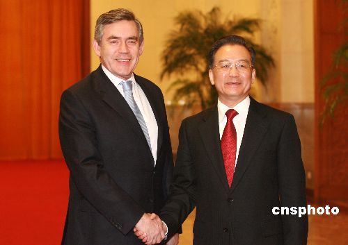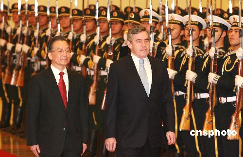 一月十八日,中國國務院總理溫家寶在北京人民大會堂主持儀式歡迎英國首相戈登·布朗訪華。中新社發 廖文靜 攝