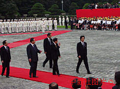 日本首相森喜朗今日在東京迎賓館舉行隆重的歡迎儀式,歡迎中國總理朱镕基總理訪日。圖為朱镕基在森喜朗首相陪同下檢閱儀仗隊(duì),向歡迎人群揮手致意。中新社記者:王曉暉
