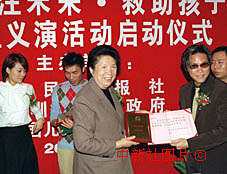 香港演藝界明星許志安、蘇永康、容祖兒,二十六日在北京人民大會堂中國兒童少年安康成長計劃工作委員會成立暨“關注未來·救助孩子”大型義演活動啟動儀式上捐贈簽名光盤,并被授予愛心大使稱號。中新社記者 李剛 攝