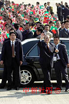 下午一點三十分,江澤民主席在澳門特別行政區行政長官何厚鏵的陪同下,乘坐掛著“澳門00一”綠色車牌的專車抵達機場,澳門警察銀樂隊奏起“歡送進行曲”,學生和市民不斷揮舞手中的旗幟和花束。滿面笑容的江澤民向送行的人們頻頻揮手,并親切地與一位小姑娘握手。