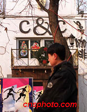 在北京三里屯酒吧區,有一家咖啡館打出申奧招牌,店里店外,帶有申奧標志的張貼畫隨處可見。中新社圖 李智勇 攝