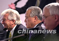 亞洲論壇新聞中心二十六日在中國海南省博鰲舉行記者招待會,中國的全國政協副主席陳錦華、哈薩克斯坦前總理捷列先科、澳大利亞前總理霍克答中外記者問。中新社記者 賈國榮 攝