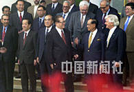 中國(guó)國(guó)家主席江澤民二十六日在海南博鰲水城集體會(huì)見(jiàn)出席亞洲論壇的貴賓,與亞洲論壇前政要們?cè)谝黄稹V行律缬浾?賈國(guó)榮 攝