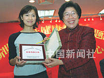 大陸正在走紅的女演員徐靜蕾,因其良好的社會聲譽和健康的形象,八日被全國婦聯授予“健康大使”。圖為全國婦聯副主席沈淑濟(右)向徐靜蕾授“健康大使”牌。中新社記者 王麗南 攝