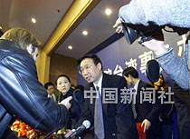 海協會秘書長李亞飛十六日在出席國臺辦的新聞發布會后,被中外記者包圍采訪。中新社記者 滿會喬 攝