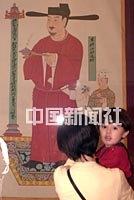 “張大千臨摹敦煌壁畫及大風堂用印展”十八日在澳門文化中心舉行,展出著名畫家張大千于四十年代臨摹敦煌莫高窟壁畫的一百三十三幅作品,圖為觀眾觀看一幅五代時期壁畫的的設色絹摹本。中新社傳真 宗金柱攝