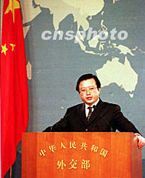 中國外交部發言人朱邦造四月三日在北京的記者招待會上,談到美國偵察機一日撞毀中國軍用飛機事件時說,中國海軍正在全力搜救我方落海飛行員。中新社記者 鄒憲 攝