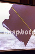 外交部十九日在北京展示美軍偵察機撞機受損機翼的圖片。中新社記者 滿會喬 攝