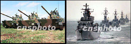 左為海軍陸戰隊兩棲坦克,右為導彈驅逐艦和導彈護衛艦組成的特混編隊
