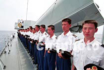 ![]() 阮國琴把花環拋進大海,祭奠自己的丈夫。中新社圖 張全躍 攝 ![]() 解放軍海軍領導,海南省政府、浙江湖州市政府官員和王偉的妻子阮國琴、姐姐王琳等乘海軍某部509艦參加了海上祭奠活動。中新社圖 張全躍 攝