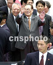中國國家主席江澤民5月8日中午乘專機抵達香港機場,參加“2001年《財富》全球論壇”,登車前向采訪的記者招手致意。中新社傳真任晨鳴攝