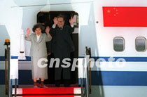 國家主席江澤民9日結束訪問香港,江澤民主席與夫人王冶坪向送行人士揮手道別。中新社傳真 盧峰 攝