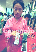 參加北京五月國際科技博覽會的日本公司,請公關小姐身穿和服展示新款可視手機和掌上電腦。中新社記者 賈國榮 攝
