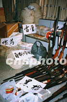 廣東廉江市公安局近日展開行動嚴(yán)厲打擊粵桂交界地區(qū)的非法制造、買賣爆炸物品等違法活動,共搗毀非法買賣炸藥窩點(diǎn)四個(gè),收繳一批炸藥、雷管、導(dǎo)爆管等物品。圖為行動中查獲的部份黑槍和爆炸物品。中新社圖 陳祥勝 攝
