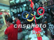 北京一家商廈正在出售用五色絲線編織的奧運五環結,隨著2008年申奧表決日期的臨近,北京人的奧運情結越系越緊。中新社記者 王瑤 攝