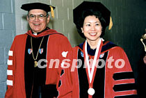 曾于一九九一年獲紐約圣若望大學榮譽法學博士的趙小蘭,二00一年五月二十日在圣大第一百三十一屆畢業典禮上,獲頒象征該校非校友最高榮譽的金質獎章。圖為禮成后趙小蘭(右)與圣若望大學校長海靈頓穿過走廊,步入會見廳,接受各界來賓及親友祝賀。中新社圖 龔文謨 攝