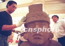 墨西哥專家(左)三十日在北京中華世紀壇內安裝瑪雅文物“王子”。包括186件瑪雅珍品的“神秘的瑪雅”--墨西哥文明展將于六月二日向觀眾開放。中新社圖 鄭萍萍 攝