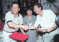 北京市兒童福利院名譽副院長、著名笑星姜昆(左)日前在北京清河接受各屆人士為北京市兒童福利院的捐款。中新社圖 史利 攝