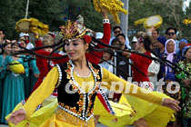 6月14日,“北京——莫斯科申奧萬里行”鳳凰車隊進疆抵達哈密市,當地民眾在哈密王陵前面舉行盛大儀式,歡迎遠道而來的客人。由哈密歌舞團表演的“哈密瓜”等民族歌舞奔放熱烈,表達了維吾爾族人民對北京申奧活動的深情厚誼。中新社圖 魏孝明 攝