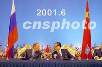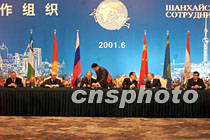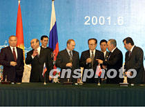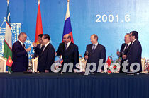"上海合作組織"成立宣言簽字儀式15日在上海舉行,中國國家主席江澤民(右3)、俄羅斯總統普京(右4)、哈薩克斯坦總統納扎爾巴耶夫(右2)、吉爾吉斯斯坦總統阿卡耶夫(右5)、塔吉克斯坦總統拉赫莫諾夫(右1)和烏茲別克斯坦總統卡里莫夫出席簽字儀式。