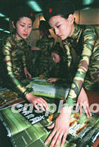 北京夏季房地產展示交易會十四日至十七日在國貿中心舉辦,房地產商業大戰隨之展開,一家公司的售樓禮儀小姐甚至穿起軍事迷彩裝為客人發放宣傳材料,希望產生更好的宣傳效果。中新社圖 張勤 攝