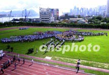 為支持北京申辦2008年奧運會,兩千多名香港市民周日在藍天白云映照下的香港灣仔運動場草坪上組成“北京申辦2008年奧運會標志”圖案。中新社記者 任晨鳴 攝