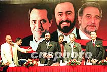 圖:三大男高音演唱會新聞發(fā)布會 2001年06月21日 18:46 ![]() 世界三大男高音北京紫禁城演唱會新聞發(fā)布會21日在北京舉行,先期到達(dá)北京的帕瓦羅蒂、卡雷拉斯和三大男高音的經(jīng)濟(jì)人魯?shù)浪沟瘸鱿⒒卮鹆酥型庥浾叩奶釂枴V行律缬浾?李剛 攝