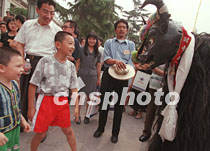 ![]() 兩名北京小朋友二十四日在北京民族文化宮參加《全國支援西藏成果展》開幕式時,同藏族叔叔裝扮的高原卡通牛玩起了游戲。中新社記者 鄒憲 攝