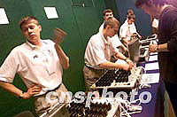 7月9日,國際奧委會在莫斯科世貿中心酒店舉行第一次新聞發布會,工作人員為各國記者提供同聲翻譯設備。中新社記者 王瑤 攝