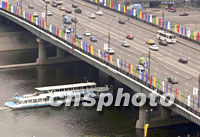 莫斯科繁華市區的河流大橋兩畔七月被國際奧委會112次會議彩旗裝扮的喜氣洋洋。中新社記者 賈國榮 攝