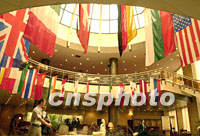 作為國際奧委會七月第一一二次全會主新聞中心的莫斯科斯拉夫飯店里,高掛各國的國旗,迎接世界各地的委員和記者。中新社記者 賈國榮 攝