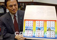 慶北京申奧 中國大陸與港澳地區同發行紀念郵票 2001年07月14日 02:26 ![]() 為慶祝北京申辦2008年奧運會成功,香港郵政、中國郵政及澳門郵政七月十四日聯合發行一紀念套摺,內載由三地郵票小版張組合相連的版張,郵票的設計是以北京申奧會徽為設計主題。中新社傳真 任海霞 攝 ![]() 13日晚,北京西長安街郵局發售申奧紀念郵票,北京眾多市民爭相購買。趙振清