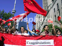 七月十三日,北京申奧成功,多倫多華人華僑在聯合火車站前街舉辦慶祝活動。中新社記者 徐德金 攝