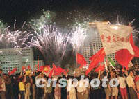 組圖:北京歡慶申奧成功 2001年07月14日 15:41 ![]() 十三日晚北京放煙花歡慶申奧成功。中新社記者 錢興強 攝 ![]() 北京申奧成功,十三日晚在北京中華世紀壇大學生們滿懷激情高呼中國萬歲。中新社記者 錢興強 攝