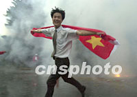 一名中國青年高舉五星紅旗,冒雨在中國駐莫斯科大使館鳴放的鞭炮煙火中狂奔,歡呼北京申辦奧運會成功。中新社記者 賈國榮 攝
