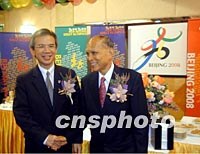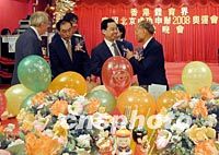 香港體育界17日晚舉行盛大聯(lián)歡會,熱烈慶祝北京申辦2008年奧運會成功,全國政協(xié)副主席霍英東與民政事務(wù)局長林煥光出席晚會,共慶中國體壇盛事。中新社傳真 洪少葵 攝